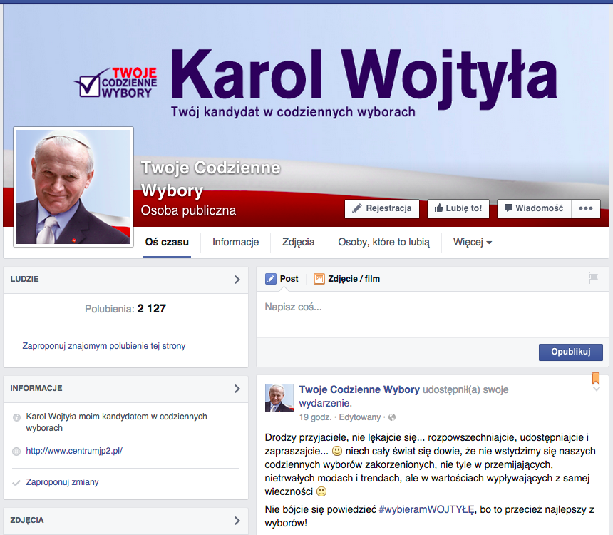 (…) Dołącz do wydarzenia i tym samym złóż deklarację poparcia dla postulatów głoszonych przez Jana Pawła II! Do godziny 21:37 2 kwietnia 2015 zbierzmy 100 tysięcy podpisów, tak żeby Karol Wojtyła znalazł się na oficjalnej liście kandydatów, którzy doradzają Ci w codziennych dylematach.”(…) – czytamy na stronie.
