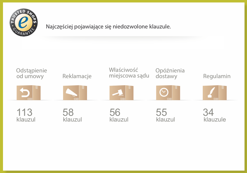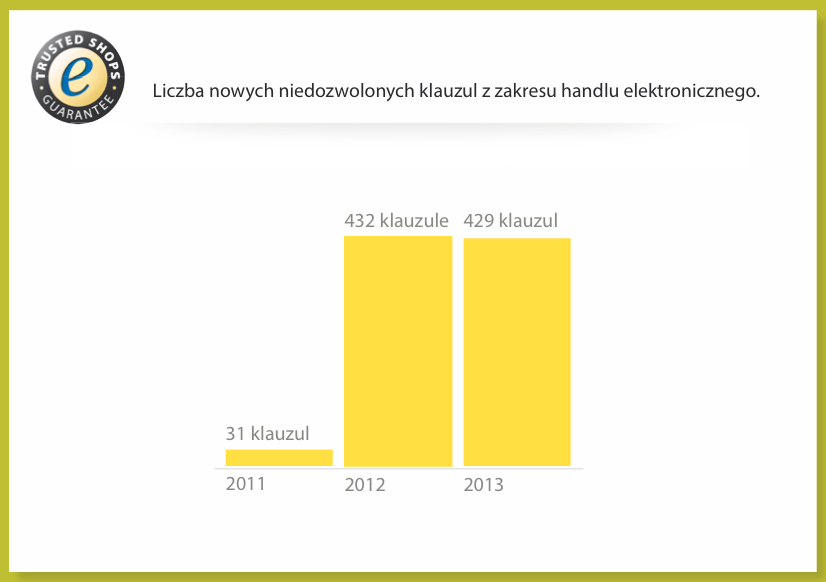 Mimo dynamicznego rozwoju sektora e-commerce w Polsce, sklepy wciąż mają problemy z właściwą interpretacją zapisów prawnych. Jak pokazuje zestawienie, sklepy wciąż powielają błędne zapisy, narażając się tym samym na wysokie kary nakładane przez UOKiK. Eksperci Trusted Shops, firmy specjalizującej się w certyfikacji sklepów internetowych, sprawdzili jakie niedozwolone zapisy pojawiały się najczęściej w regulaminach w 2013 roku. Analiza pozwoliła określić aspekty prawne, które sprawiają polskim przedsiębiorcom już mniej trudności oraz obszary, na które powinni zwrócić szczególną uwagę, aby uniknąć pojawienia się niedozwolonych klauzul w regulaminach sklepów.