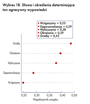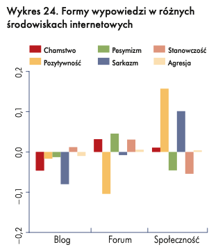 Cytując autora: „Analizy przedstawione w badaniu pokazują, że istnieją różnice, jakie formy wypowiedzi pojawiają się w różnych środowiskach internetu. Jak pokazuje wykres 24, w środowisku serwisów społecznościowych dominują wypowiedzi pozytywne w formie i treści oraz sarkazm. Na forach internetowych zaś są to pesymistyczne wizje świata, chamstwo (przekraczanie granic kultury wypowiedzi) oraz stanowczość. Blogi charakteryzują się małą ilością sarkazmu i chamstwa. Natomiast agresja jest w podobnym stopniu obecna we wszystkich trzech środowiskach”.