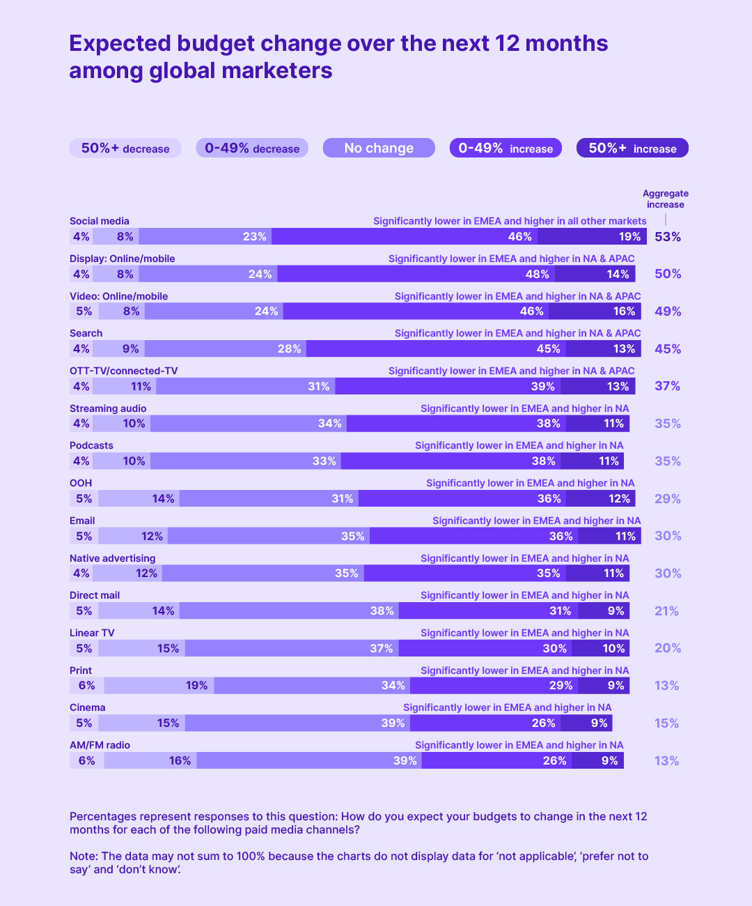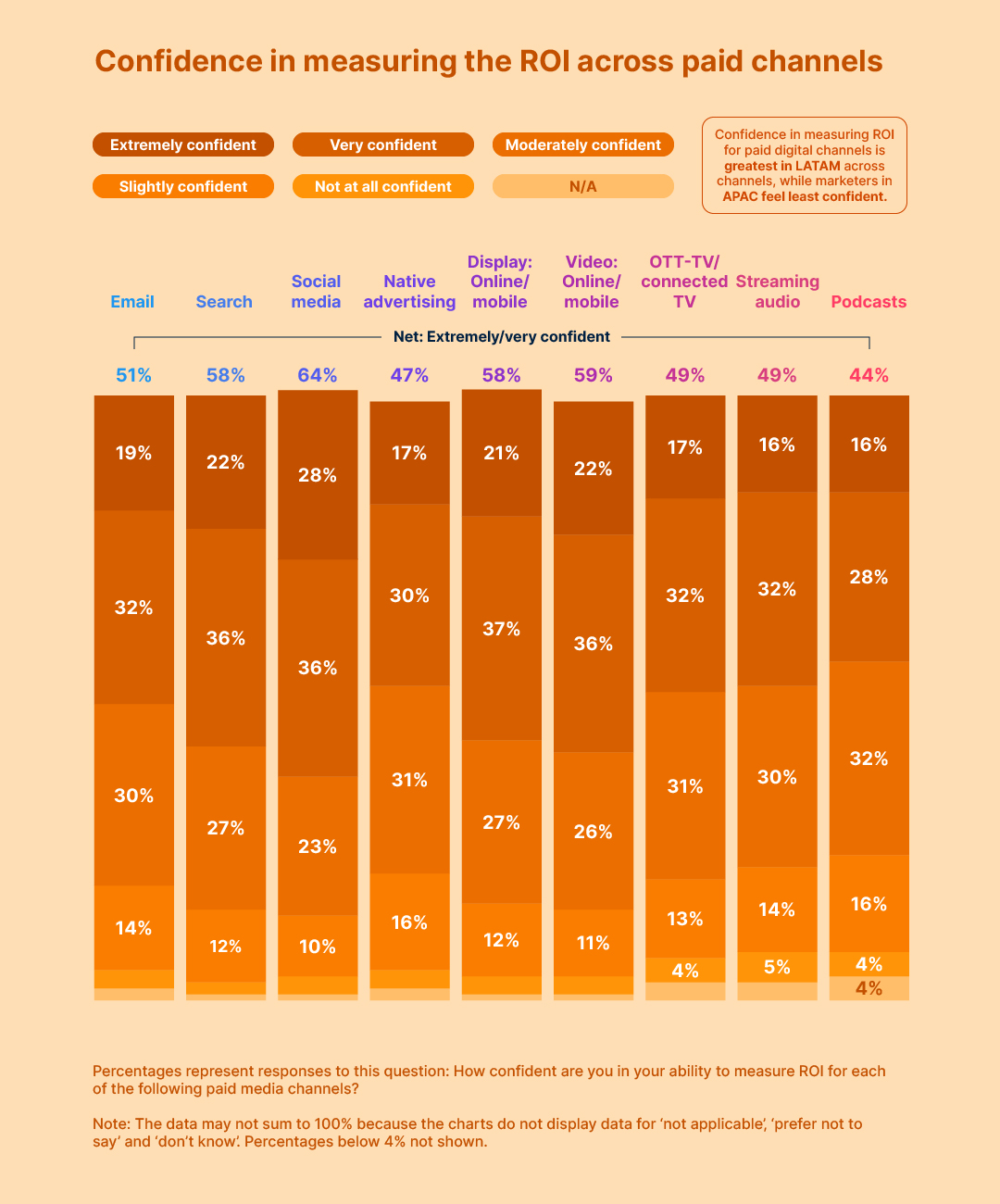 - Zwiększone rozdrobnienie mediów wzmacnia potrzebę pomiaru całościowego. Tylko 54% marketerów ufa wynikom pomiarów ROI dla całego lejka. Pomijając wideo online i mobile video, zaufanie do wyników pomiaru ROI we wszystkich kanałach wynosi poniżej 50% (w ujęciu światowym) i chociaż prawie połowa marketerów planuje zwiększyć wydatki na podcasty, tylko 44% z nich ufa wynikom pomiarów ROI dotyczącym tych inwestycji.