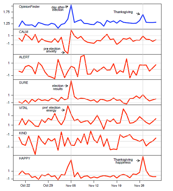 Amerykańscy naukowcy przeprowadzili badanie nastrojów na amerykańskim Twitterze. Uczeni chcieli poznać odpowiedź na pytanie „W jakie dni i w jakich godzinach amerykańscy konsumenci są w najlepszym nastroju?”. Celem finalnym było oczywiście wyświetlanie im reklam, w momencie w którym są najbardziej szczęśliwi. Za pomocą automatycznego algorytmu zbadano oceny sentymentu ponad miliona tweetów w ciągu 7 tygodni. Stany emocjonalne podzielono na sześć kategorii: CALM, ALERT, SURE, VITAL, KIND i HAPPY (zob. wykres).