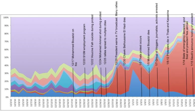 Co ciekawsze, badanie mediów społecznościowych coraz częściej pozwala na analizę wydarzeń społeczno- politycznych. Firma badawcza Topsy Labs obserwowała komentarze na Twiterze w kontekście rewolucji w Tunezji, Egipcie i na Bliskim Wschodzie. Firma starała się zbadać czy istnieje korelacja pomiędzy rzeczywistymi wydarzeniami na Bliskim Wschodzie, a Tweetami zawierającymi hashtagi ze słowami: Iran, Egipt, Jemen czy Tunezja. Jak udało się ustalić na podstawie postów, domino zdarzeń rozpoczęło się po śmierci 26-letniego Mohammeda Bouazizi w Egipcie. Twitter okazał się głównym narzędziem podnoszenia świadomości podczas rewolucji. Dane z Topsy Labs pokazały, że istnieje silne powiązanie pomiędzy rzeczywistymi wydarzeniami, a negatywnymi emocjami i komentarzami publikowanymi w interencie. Dokonując analizy zdarzeń, firma uznała, że na podstawie obserwacji portali społecznościowych, można np. określić prawdopodobieństwo wybuchu rewolucji. Być może dlatego rząd USA postanowił wcielić w życie projekt badawczy, którego celem jest gromadzenie i weryfikowanie danych pochodzących z mediów społecznościowych.