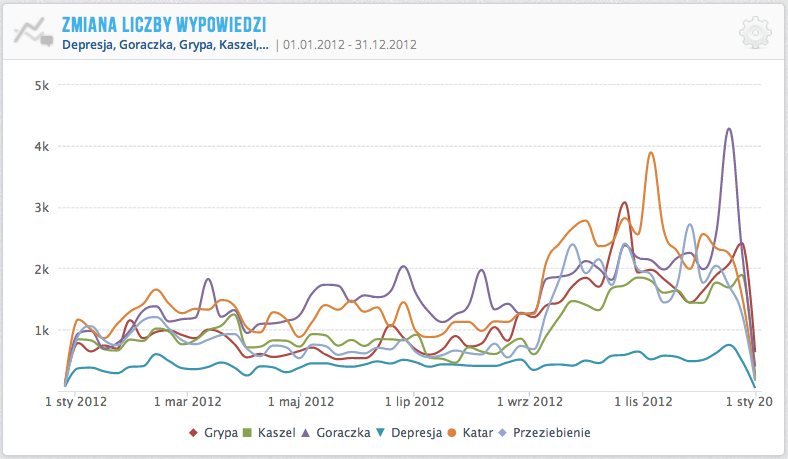 Również firma Sentione przeprowadziła badanie, tym razem na polskim rynku dotyczące zachorowań Polaków na grypę. W tym celu przeprowadziliśmy analizę wypowiedzi internautów w mediach społecznościowych dotyczących grypy. Badanie objęło wypowiedzi z okresu całego roku i zwierało hasła klucze, takie jak gorączka, kaszel, grypa, katar i tym podobne. Celem analizy było zbadanie, czy istnieje korelacja pomiędzy dyskusją w internecie na temat objawów grypy oraz występowaniem samej choroby.