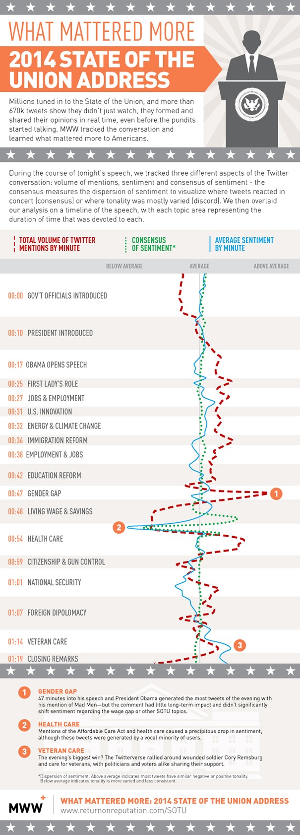 W tym celu uruchomiono monitoring Twittera i przeanalizowano 670,000 tweetów opublikowanych podczas orędzia Prezydenta do narodu. Zespół analityków badał komentarze i nacechowanie emocjonalne każdego słowa proklamacji w czasie rzeczywistym. Wszystko po to, żeby poznać odpowiedź na pytania: „Jak Amerykanie postrzegają poruszane w orędziu kwestie?” oraz „Do których tematów podchodzą najbardziej emocjonalnie?”, a przede wszystkim, „Co chcą usłyszeć i jakich rozwiązań się spodziewają?”.