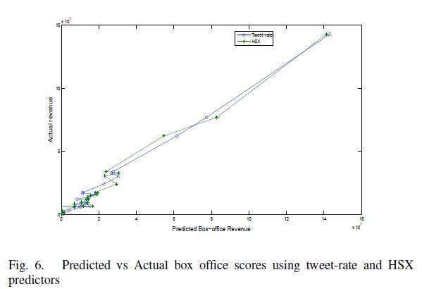 Powyższy wykres pokazuje wyniki predykcji na podstawie analizy tweetów w porównaniu do rzeczywistych wyników sprzedaży biletów w kinach w oparciu o Hollywood Stock Exchange. Model stworzony przez HP okazał się skuteczniejszy niż giełda HSX, ponieważ potrafił przewidzieć wyniki kasowe filmów z 97,3% dokładnością.