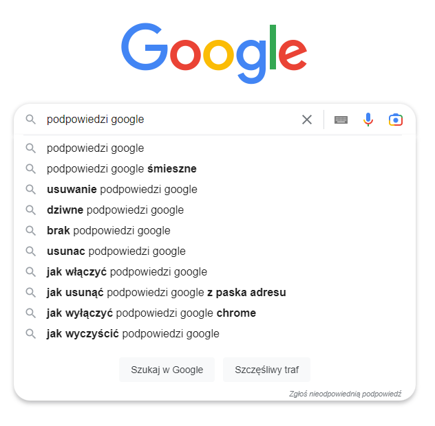 Sugestii i podpowiedzi możemy doświadczyć już przy pierwszym kontakcie z wyszukiwarką. Gdy wpisujemy do paska jakąś frazę kluczową, wyszukiwarka podpowiada, jak moglibyśmy dokończyć myśl. Dla niektórych takie sugestie mogą być pomocne, dla innych będą niczym frustrujący rozmówca, który nie daje dokończyć zdania, tylko od razu je dopowiada. Kiwając do tego głową, jakby sam chciał potwierdzić swoją sugestię.