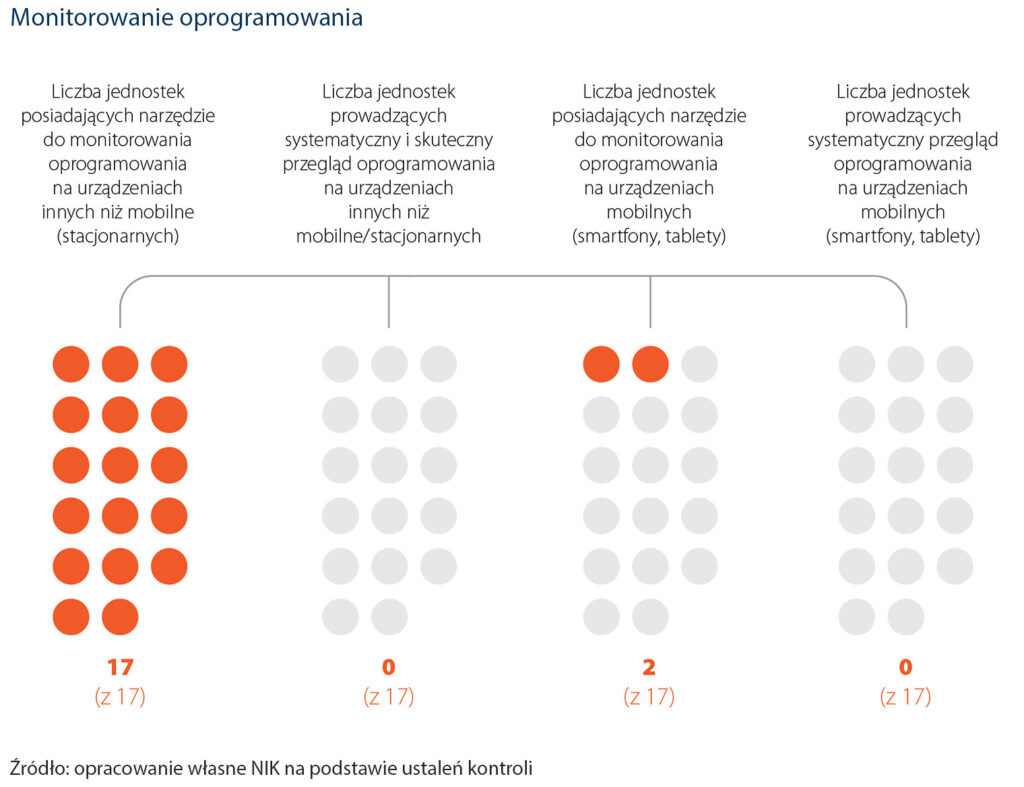 Żaden ze skontrolowanych podmiotów nie potwierdził, że na bieżąco i skutecznie sprawdza stacje robocze i udostępnione udziały sieciowe użytkowników pod kątem obecności nieautoryzowanego oprogramowania. Ponadto raport NIK informuje, że oprogramowanie na urządzeniach mobilnych pozostawało zupełnie poza nadzorem. Żadna z jednostek nie zapewniła rozwiązań technicznych do monitorowania tego rodzaju oprogramowania, nie zadbała także o stosowne działania organizacyjne.