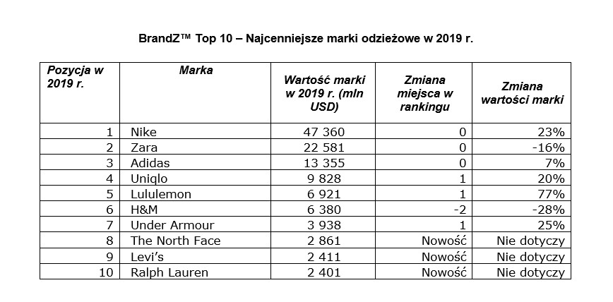 Innowacyjne, nowe tkaniny i wzory w ubraniach pełniących podwójną rolę – sportową i rekreacyjną – przyczyniły się do zwiększenia wartości marek odzieżowych w rankingu najcenniejszych marek świata BrandZ Top 100 za rok 2019, ogłoszonym przez WPP i Kantar.