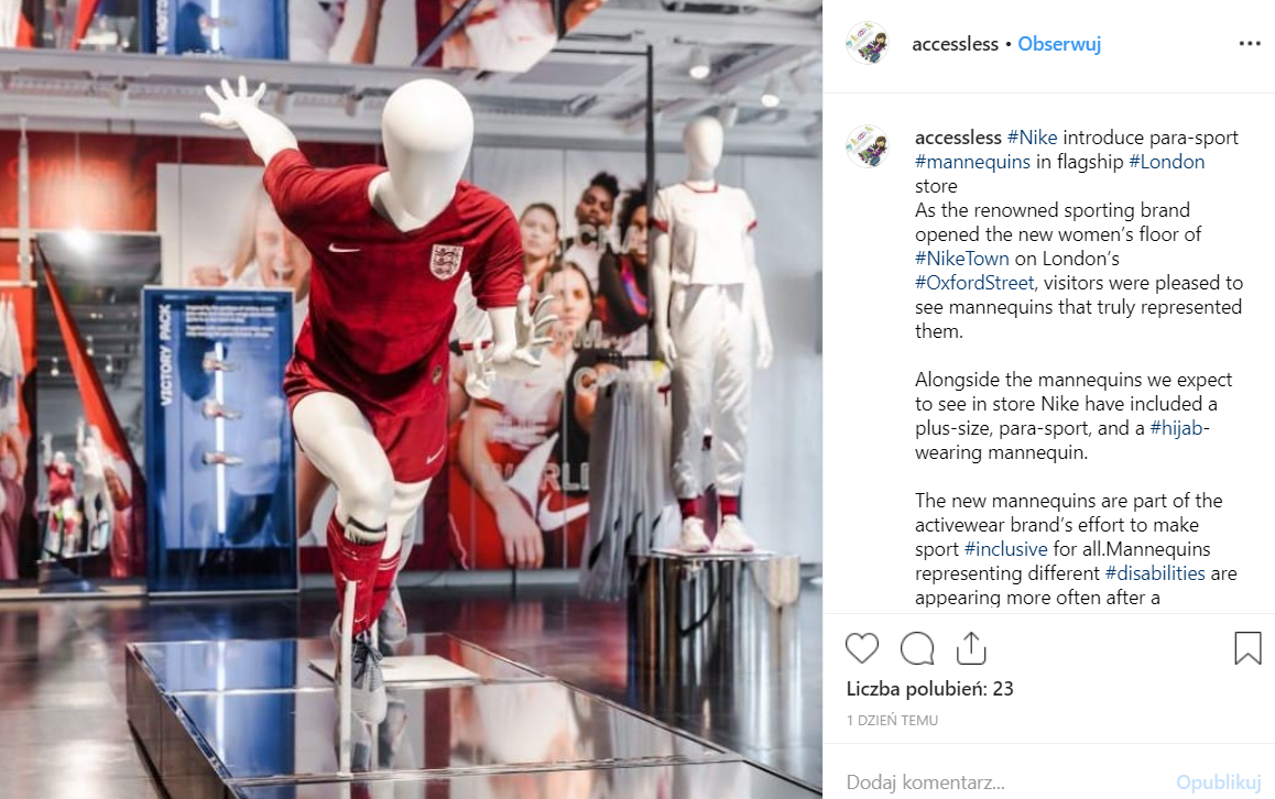 Teraz o krok dalej poszła marka Nike, która w swoim flagowym butiku w Londynie wprowadziła manekiny plus size. Co więcej, jak podaje CNN w sklepie znalazły się również manekiny, które przedstawiają osoby niepełnosprawne. Wszystko po to, by „celebrować różnorodność w sporcie i poczucie przynależności do niego”.