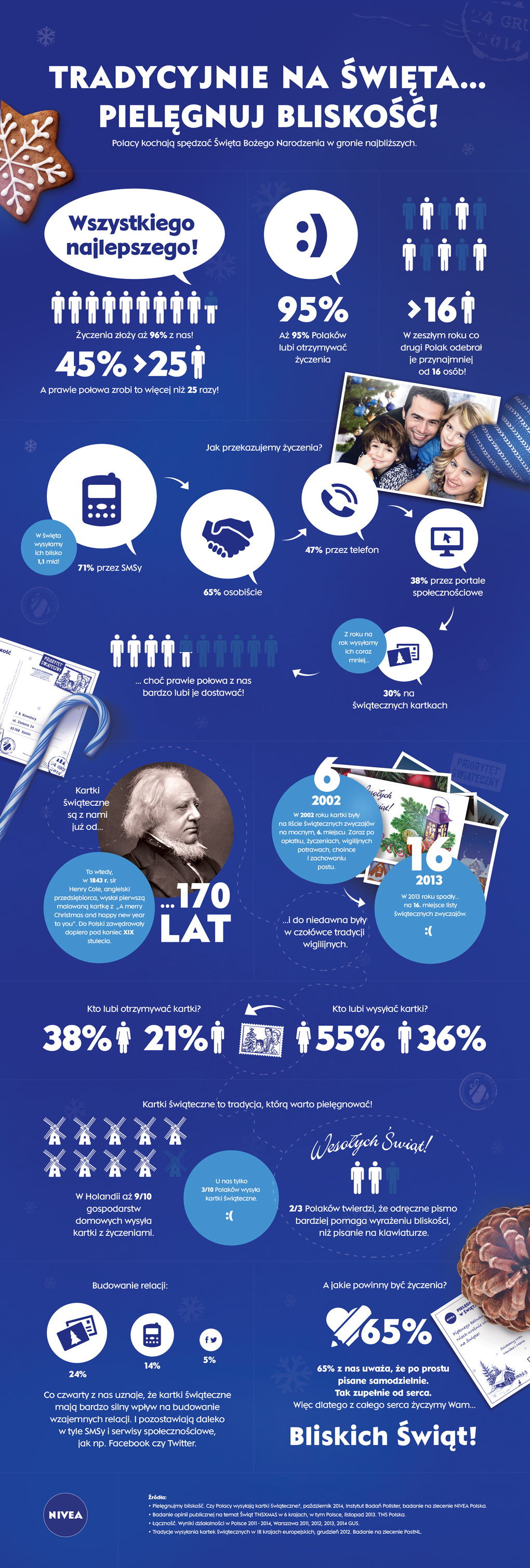 Według badań wykonanych na zlecenie NIVEA, z każdym rokiem Polacy wysyłają coraz mniej kartek świątecznych, mimo iż prawie połowa z nas bardzo lubi je dostawać. Warto też zaznaczyć, że co czwarty Polak uznaje, iż to właśnie kartki świąteczne mają najsilniejszy wpływ na budowanie prawdziwej bliskości. Dla porównania, SMS-y wskazało tylko 14% osób, a serwisy społecznościowe – jedynie 5%.