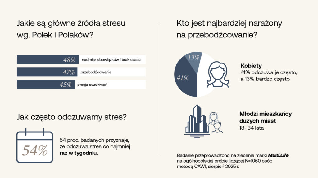 Z badania przeprowadzonego na zlecenie Benefit Systems, dostawcy platformy wellbeingowej Multi.Life, wynika, że 47 proc. Polaków wskazuje przebodźcowanie jako główne źródło stresu. Zaraz obok pojawiają się nadmiar obowiązków (48 proc.) oraz presja oczekiwań (45 proc.).