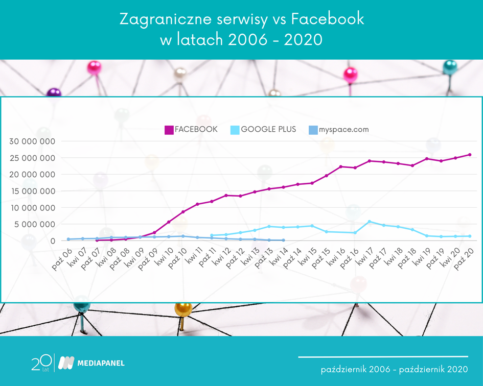 Zanim na polskim rynku zadebiutował Facebook, w krótkim czasie dokonując na nim rewolucji, działały na nim już rodzime media społecznościowe. Niektóre z nich do dziś wspominamy z nostalgią, o innych niewielu pamięta. Polskie próby budowy społeczności to m.in. epuls.pl – działający w latach 2002 – 2017 serwis dla młodzieży. W październiku 2004, kiedy to opublikowaliśmy pierwsze wyniki pomiaru widowni internetowej, odnotował on 161,3 tys. realnych użytkowników. W tym samym czasie inny serwis, fotka.pl, dotarł do 178 tys. internautów. W kolejnych latach stopniowo budował on swoją popularność, osiągając najlepsze wyniki w latach 2007/2008 – ponad 2,7 mln RU.