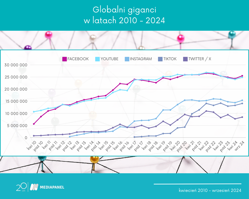 Analizie poddano media społecznościowe w interwałach półrocznych (październik – kwiecień) w okresie październik 2004 – wrzesień 2024.