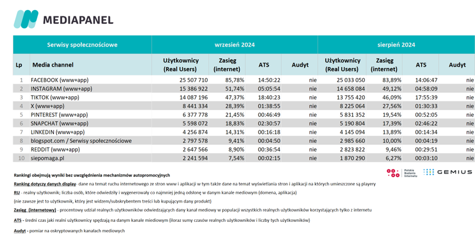 Im większą popularność zdobywał w Polsce Facebook, tym gorzej radzili sobie lokalni gracze. Facebook przekroczył próg 2 mln realnych użytkowników już w 2009, w roku, w którym zasięg wszystkich serwisów społecznościowych w polskim internecie znacząco wzrósł i sięgnął 82%. W kolejnych latach pozycja Facebooka tylko się umacniała, by w 2020 przekroczyć granicę 25 mln RU. Na tym poziomie (z okresowymi spadkami i wzrostami) liczba jego użytkowników utrzymuje się do dziś (25,5 mln we wrześniu 2024). Aktualnie jest to serwis społecznościowy cieszący się w Polsce największym zasięgiem.