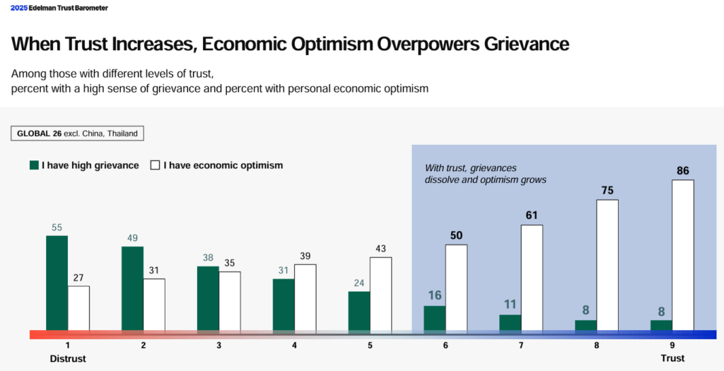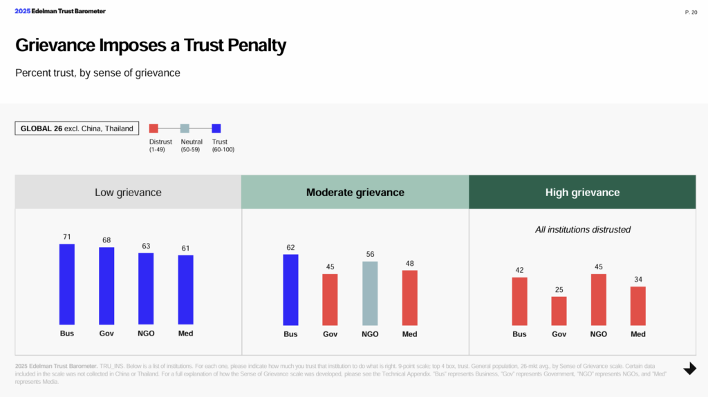 Pogłębiający się na przestrzeni ostatnich 25 lat kryzys zaufania do instytucji doprowadził do rosnącego poczucia krzywdy, które hamuje wzrost i innowacje. Zdaniem Edelmana ten trend można odwrócić, ale wymaga to wspólnego działania i lepszej współpracy wszystkich instytucji – biznesu, rządu, mediów i NGO.