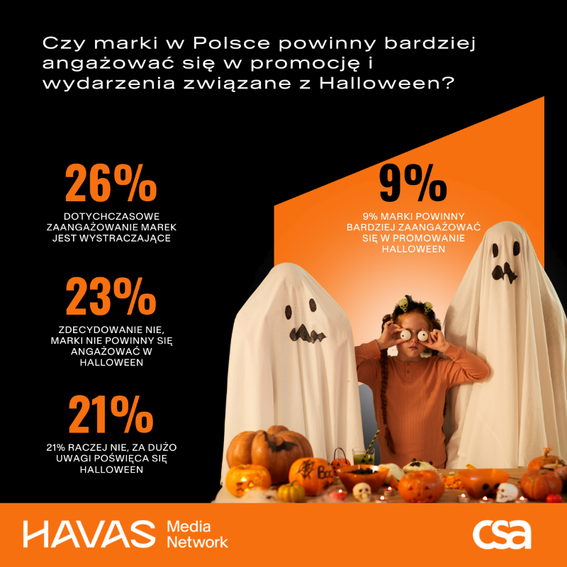 – Halloween stanowi część naszej codzienności. Przyzwyczailiśmy się już do dekoracji, w których dominują dynie, duchy i czarownice. Nie podchodzimy do tego dnia aktywnie – tylko 15% dorosłych Polaków wskazuje, że podejmuje jakiekolwiek aktywności w tym dniu – zatrzymujemy się jednak na etapie dekoracji i wieczorów filmowych z kinem grozy. Halloween to dla nas raczej ciekawy aspekt popkulturowy niż stała część naszej kultury. Nastawienie Polaków nie przekłada się również na aspekt zakupowy – raczej unikamy kupowania produktów tematycznie związanych z Halloween – to dla niemal połowy Polaków niepotrzebny wydatek. Do halloweenowych promocji i eventów podchodzimy raczej z obojętnością i lekkim zaciekawieniem – nie angażują one naszej uwagi w dużym stopniu. Nie uważamy również, że marki powinny zwiększać swoją aktywność w kontekście Halloween. To więc dla Polaków wciąż bardziej „ciekawostka”, niż wydarzenie realnie angażujące nasze zachowania i „portfele” – komentuje Anna Ostrowska, Insights Manager CSA, Havas Media Network.