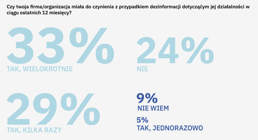 - 62% badanych przedstawicieli organizacji doświadczyło dezinformacji w ciągu ostatnich 12 miesięcy. Aż jedną trzecią z nich dotknęła ona wielokrotnie. A tylko 24% nie miało do czynienia z przypadkami dezinformacji dotyczącymi swojej działalności. Tylko co 10. badana osoba nie wie, czy jej organizacja zetknęła się z dezinformacją, a zaledwie 7% respondentów uważa, że problem jest marginalny. Świadomość – w miarę zagrożenia – rośnie.