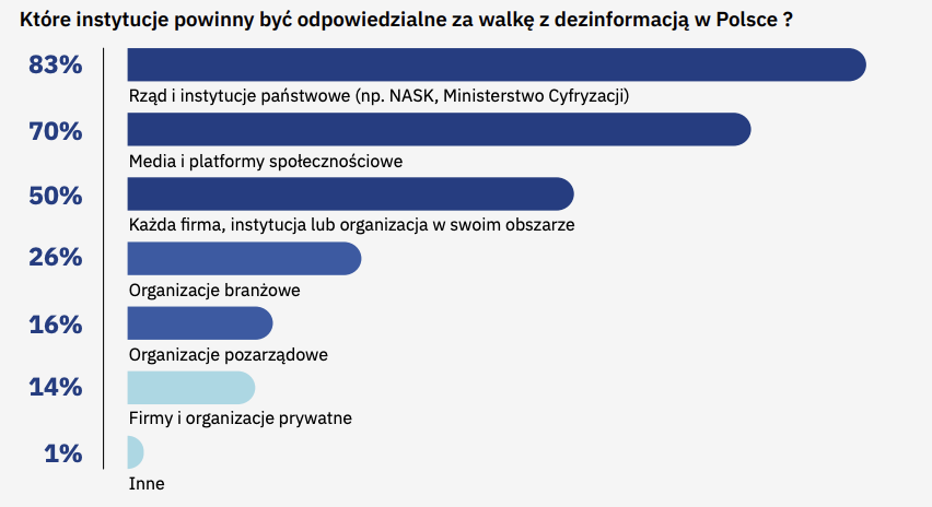 - Być może takie nieprzygotowanie wynika z faktu, że zdaniem 83% ankietowanych to przede wszystkim rząd i podległe mu jednostki, np. NASK czy Ministerstwo Cyfryzacji, są odpowiedzialne za walkę z dezinformacją. 70% współodpowiedzialność za to zadanie widzi w mediach i platformach społecznościowych, a co drugi badany twierdzi, że walkę z dezinformacją w swoim obszarze powinna prowadzić każda firma i organizacja.
