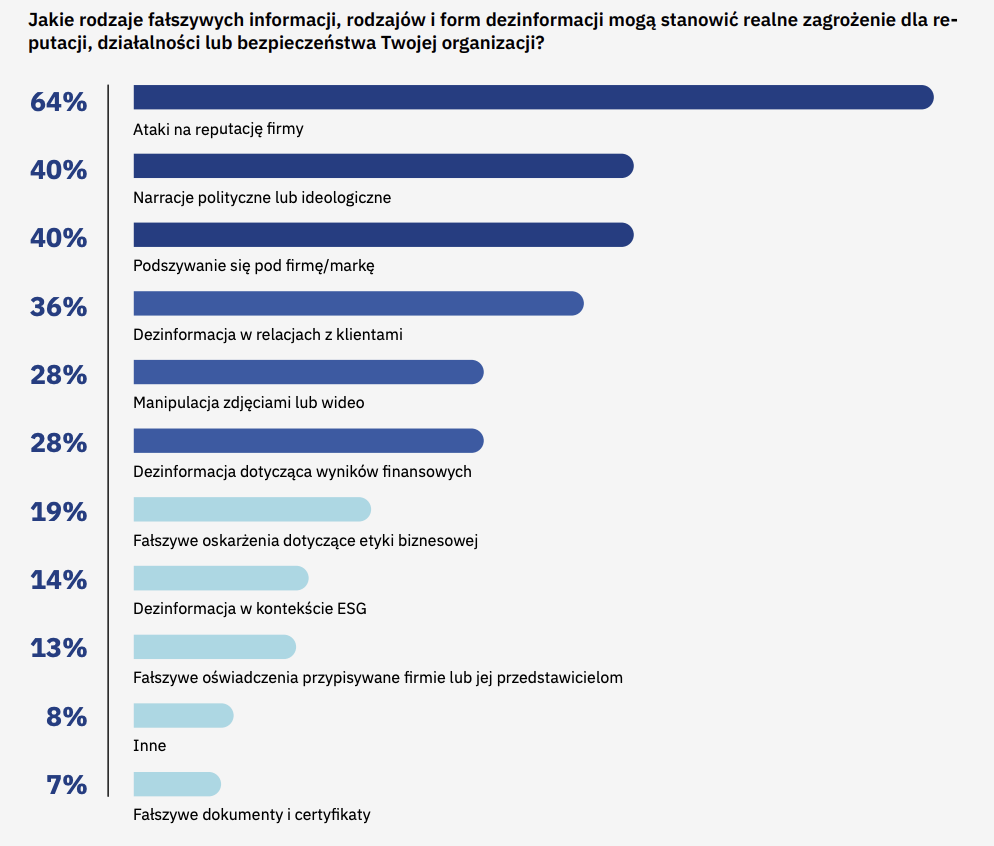 - Największy lęk wśród polskich firm i organizacji budzą ataki na reputację – wskazało je aż 64% respondentów. Niewiele mniej, bo prawie połowa ekspertów ds. komunikacji (40%) obawia się również politycznych i ideologicznych narracji, w które mimowolnie może zostać wciągnięta ich firma czy organizacja, a także podszywania się pod markę poprzez fałszywe strony internetowe, phishing czy zakładanie fałszywych profili w social mediach, co również dotkliwie godzi w zaufanie.