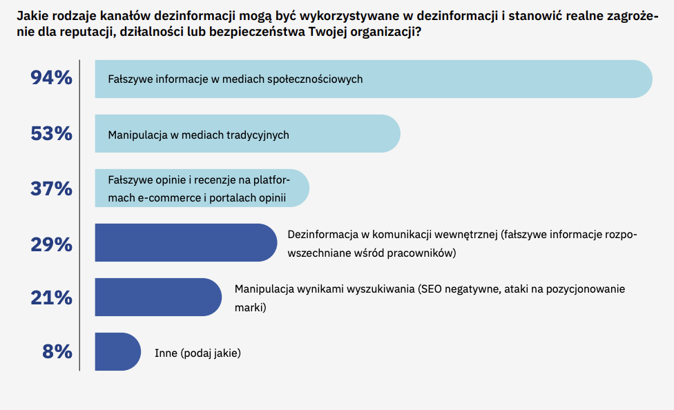 - Badani eksperci komunikacji in-house są zgodni, że największym zagrożeniem dla ich organizacji są media społecznościowe. To w nich, zdaniem prawie wszystkich (94%) badanych, najłatwiej rozprzestrzeniają się treści manipulacyjne, memy lub celowe przekłamania, które w szybkim czasie mogą dotrzeć do ogromnej liczby odbiorców. Ponad połowa respondentów (53%) zagrożenie widzi również w mediach tradycyjnych, które większości odbiorców kojarzą się z rzetelnością i autentycznością przekazu. Ale źródłem dezinformacji mogą być również fałszywe opinie i recenzje w e-commerce i na portalach opinii (37%), a nawet komunikacja wewnętrzna (29%).