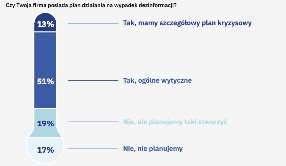 Tylko nieco ponad połowa (51%) firm ma ogólne wytyczne dotyczące działań w obliczu fałszywych informacji, a zaledwie 13% badanych posiada szczegółowy plan kryzysowy na wypadek sytuacji dezinformacyjnych. Niemal co piąta organizacja (19%) przyznaje, że dopiero planuje stworzyć taki dokument, a aż 17% organizacji planu nie posiada i w ogóle nie zamierza go opracowywać.
