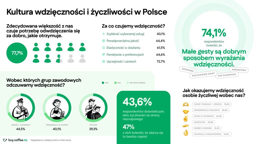 – Wyniki badań jednoznacznie wskazują, że Polacy pragną wyrażać wdzięczność nie tylko w obliczu wyjątkowych wydarzeń, ale również doceniając codzienne usługi, które podnoszą komfort życia – podsumowuje Piotr Kędzia, Prezes Zarządu Coffee Media sp. z o.o. właściciela serwisu www.buycoffee.to.