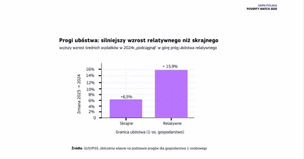Według raportu „Poverty Watch 2025” przygotowanego przez EAPN Polska, zasięg skrajnego ubóstwa w 2024 r. zmniejszył się z 6,6% (2,5 mln osób) do 5,2% (1,9 mln). To efekt wzrostu płacy minimalnej, podwyżki świadczenia wychowawczego do 800 zł oraz spadku inflacji. Jednak pozytywne dane maskują rosnące nierówności — wskaźnik ubóstwa relatywnego (wydatki poniżej 50% średniej krajowej) wzrósł z 12,2% do 13,3%, czyli dotyczy już około 5 mln Polaków.
