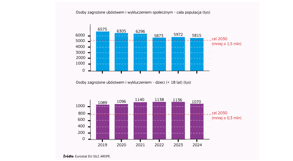Według raportu „Poverty Watch 2025” przygotowanego przez EAPN Polska, zasięg skrajnego ubóstwa w 2024 r. zmniejszył się z 6,6% (2,5 mln osób) do 5,2% (1,9 mln). To efekt wzrostu płacy minimalnej, podwyżki świadczenia wychowawczego do 800 zł oraz spadku inflacji. Jednak pozytywne dane maskują rosnące nierówności — wskaźnik ubóstwa relatywnego (wydatki poniżej 50% średniej krajowej) wzrósł z 12,2% do 13,3%, czyli dotyczy już około 5 mln Polaków.