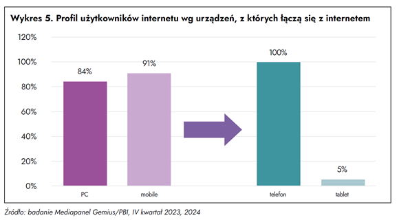 W 2024 roku liczba internautów utrzymała się na zbliżonym poziomie w porównaniu z 2023 rokiem. Nastąpił natomiast dynamiczny wzrost popularności internetu mobilnego. Najwięcej czasu w internecie Polacy spędzili, korzystając z aplikacji mobilnych (65% całkowitego czasu online). Największy wzrost liczby internautów odnotowano w grupie wiekowej 65–75 lat, co świadczy o rosnącej popularności internetu wśród seniorów.