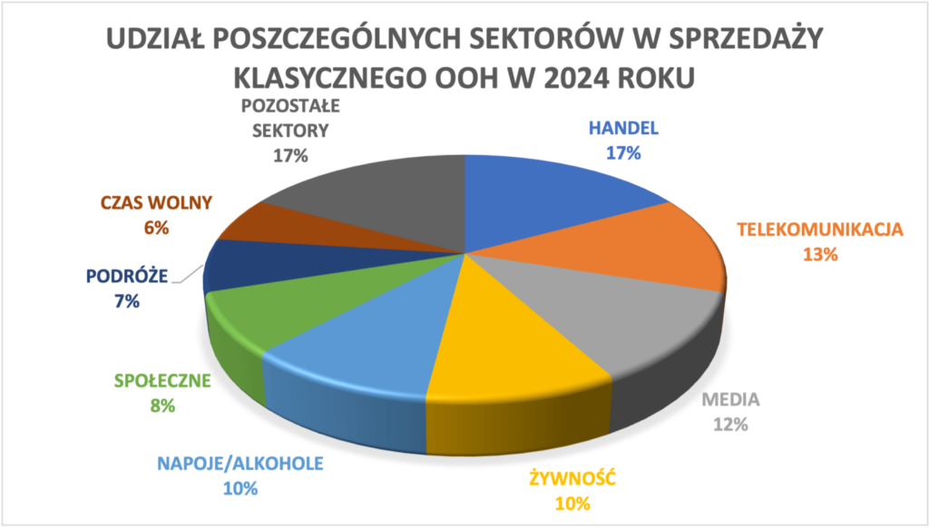 Wydatki promocyjno-reklamowe w klasycznym OOH w 2024 roku koncentrowały się w sektorach: handel, telekomunikacja, media, żywność, napoje i alkohole (dominujące w miesiącach letnich), czas wolny i podróże (charakterystyczne dla okresu wakacyjnego).
