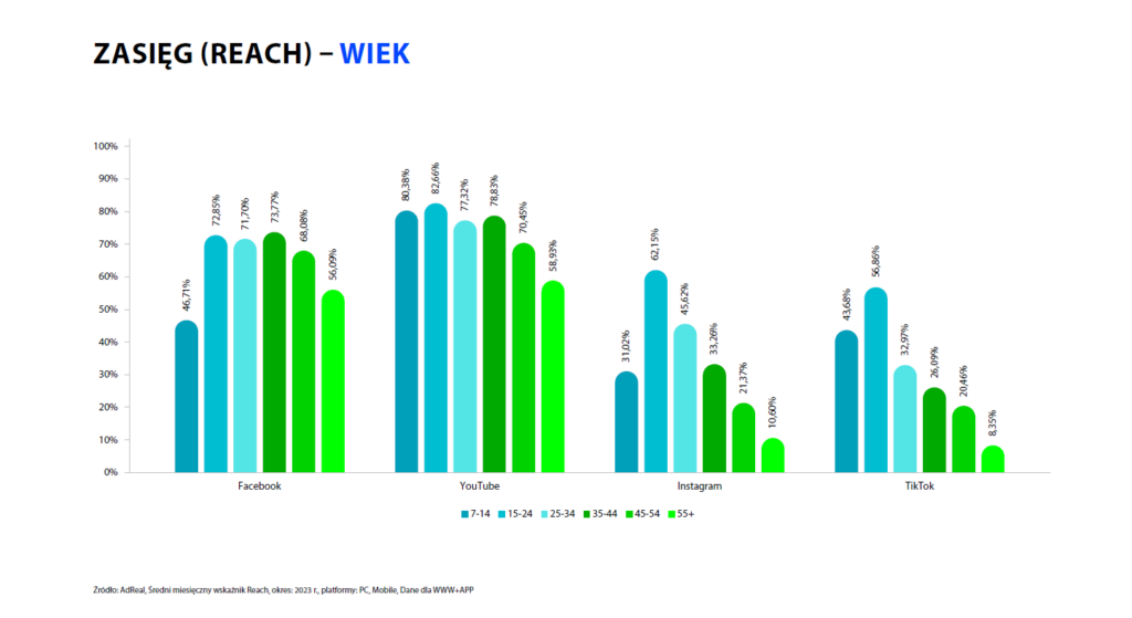 Pozostałe serwisy, takie jak TikTok czy Instagram, cieszą się zmiennym zainteresowaniem, w zależności od analizowanych grup wiekowych użytkowników.