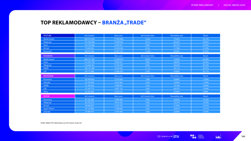 Podobnie jak w ubiegłym roku, również dziś to Facebook i YouTube wiodą prym w obszarze reklamy internetowej w naszym kraju. Ten pierwszy przoduje pod względem liczby kontaktów reklamowych (12,1 mld), zaś drugi może się pochwalić największym zasięgiem reklamowym (72,1%).