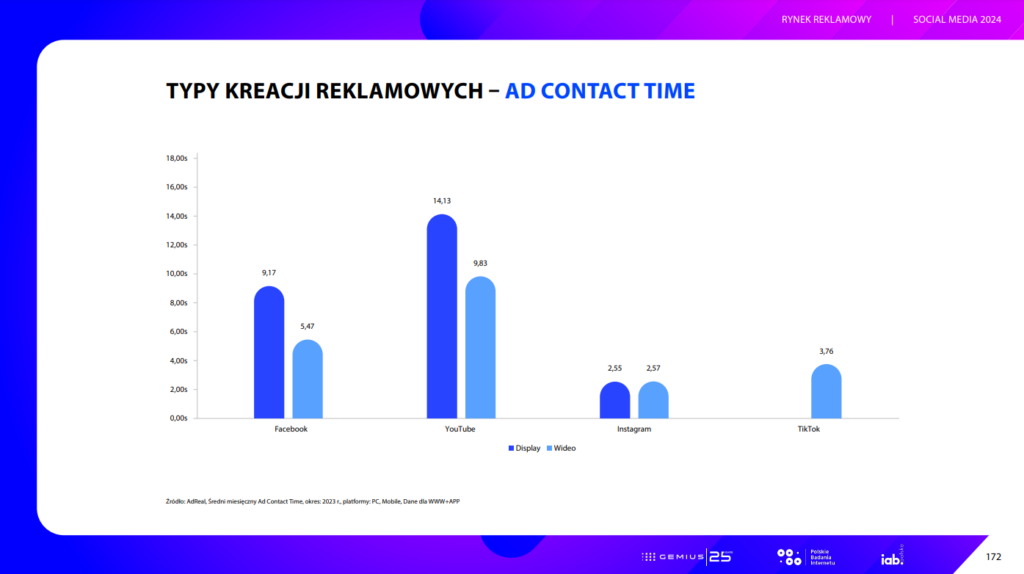 Czas kontaktu z reklamą (ad contacts time), zarówno na Facebooku, jak i na YouTubie jest dluższy dla kreacji typu display niż wideo. W przypadku Facebooka jest to odpowiednio 9,2 vs 5,5 sekundy, w przypadku YouTube’a – 14,13 vs 9,83 sekundy.