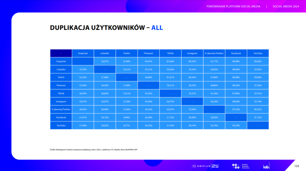 Każdy z omawianych serwisów społecznościowych w największym stopniu duplikuje się z liderami rynku – platformami Facebook i YouTube. W większości przypadków w grupie internautów w wieku 7-75 duplikacja plasuje się na poziomie 97-98%, przy czym zawsze przekracza 90%. Wynika to z bardzo wysokich zasięgów Facebooka i YouTube’a w populacji.