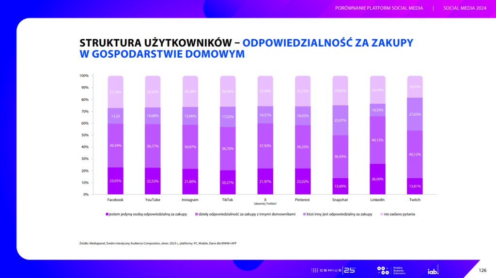 Okazuje się, że większość, to jest ponad 10 milionów użytkowników, dzieli obowiązki zakupowe z innymi domownikami. Użytkownicy, którzy sami zajmują się zakupami, to grupa licząca ponad 6,3 milionów. Z kolei grupa osób z gospodarstw domowych, w których to inni są odpowiedzialni za zakupy, liczy około