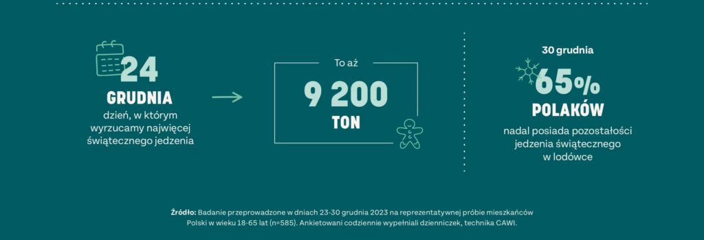 Jak wskazują badania przeprowadzone przez Too Good To Go we współpracy z pracownią Opinia24, aż 63% Polaków przygotuje więcej jedzenia niż to potrzebne na trzy dni świąt. Ponadto, aż 8 na 10 Polaków (83%) w okresie świątecznym (między 23 a 30 grudnia) wyrzuca łącznie 61,7 tys. ton żywności, czyli aż 1,6 kg jedzenia na osobę. Najwięcej – 9,2 tys. ton – marnuje się 24 grudnia, który można niechlubnie nazwać Dniem Świątecznego Marnowania Żywności.