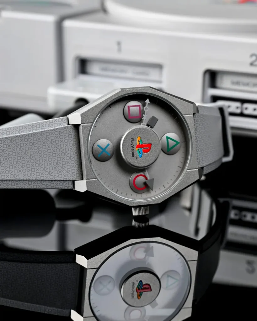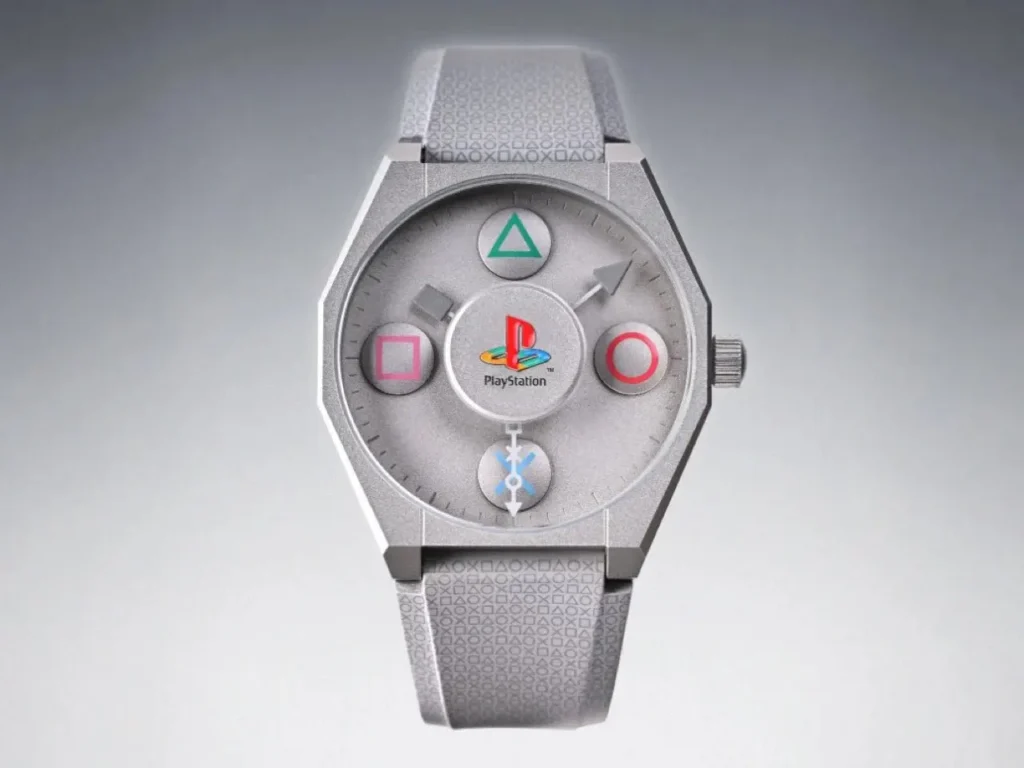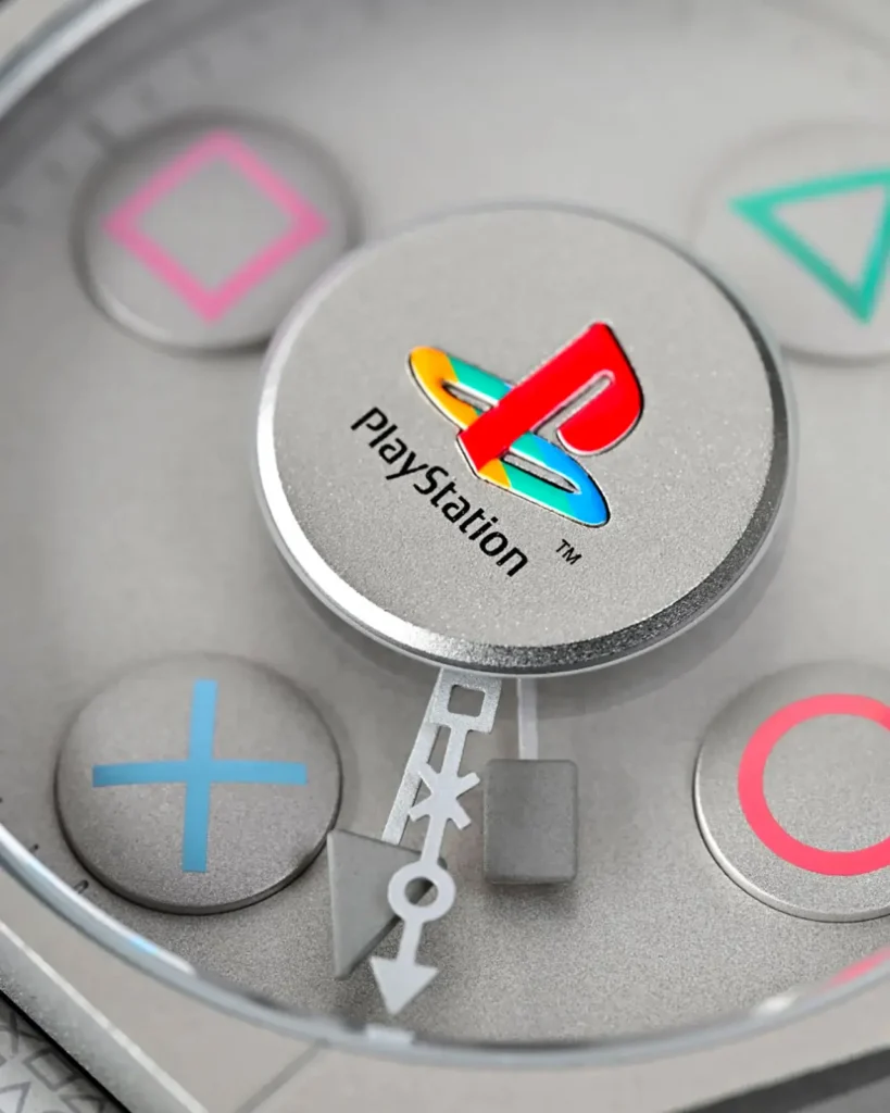 - na tarczy zegarka umieszczono ikoniczne symbole przycisków – △ ○ × □ – w miejsce tradycyjnych indeksów,
