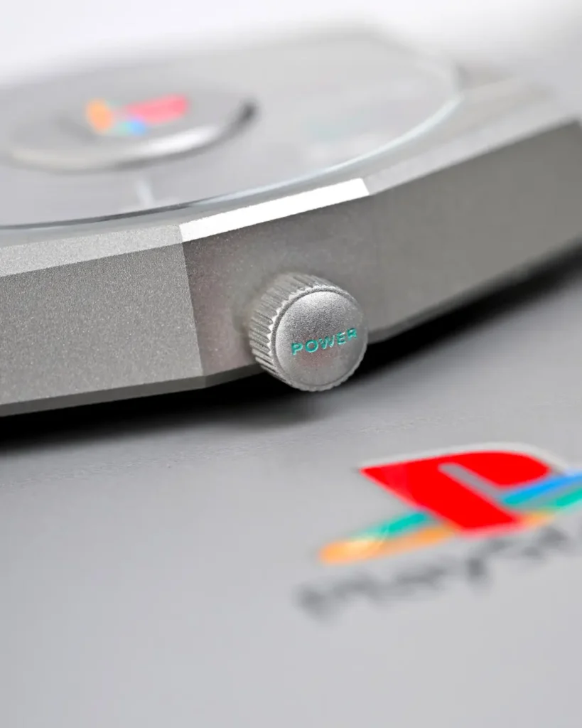 - wskazówki inspirowano przyciskami Start i Select, a korona zegarka nosi znak zasilania, jak ten, który wszyscy znamy z włączania PS1.