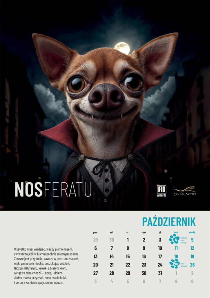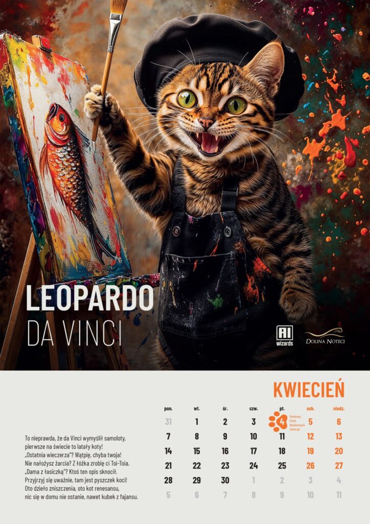 Obie wersje „Łap kalendarza 2025” to 24 karty ozdobione wykreowanymi w AI wizerunkami psów i kotów oraz 24 wiersze-humoreski, które są dziełem niesztucznej inteligencji.