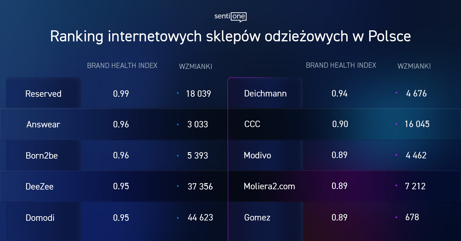 W zestawieniu marek o najwyższym wskaźniku Brand Health Index znalazło się sporo platform typu multibrand, oferujących produkty różnych firm, chociaż nie zabrakło też sklepów własnych, a pierwsze miejsce zajęła marka Reserved. Za nią uplasowały się Answear, Born2be, DeeZee, Domodi, Deichmann i CCC. Pierwszą dziesiątkę zamykają platformy oferujące ubrania i dodatki marek premium – Modivo, Moliera2.com oraz Gomez. Pod względem liczby wzmianek najwyższą pozycję wśród wymienionych zajmuje Domodi (44,6 tys.), drugą DeeZee (37,3 tys.), a trzecią Reserved (18 tys.).