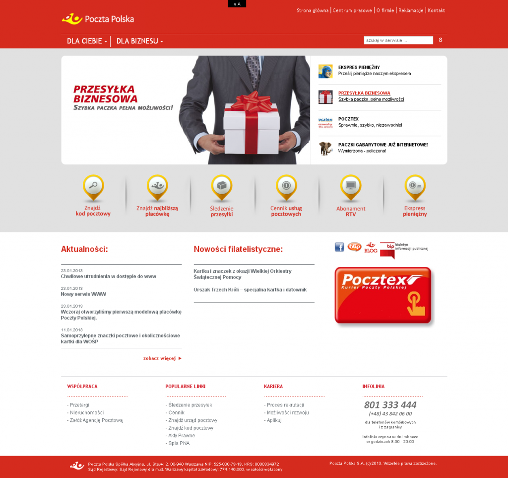 23 stycznia pojawi się nowa strona internetowa Poczty Polskiej. Uruchomienie witryny jest pierwszym krokiem budowy nowoczesnego oraz przyjaznego klientom portalu. W ramach prac nad serwisem pojawiły się funkcjonalności ułatwiające użytkownikom dostęp do oferty firmy.