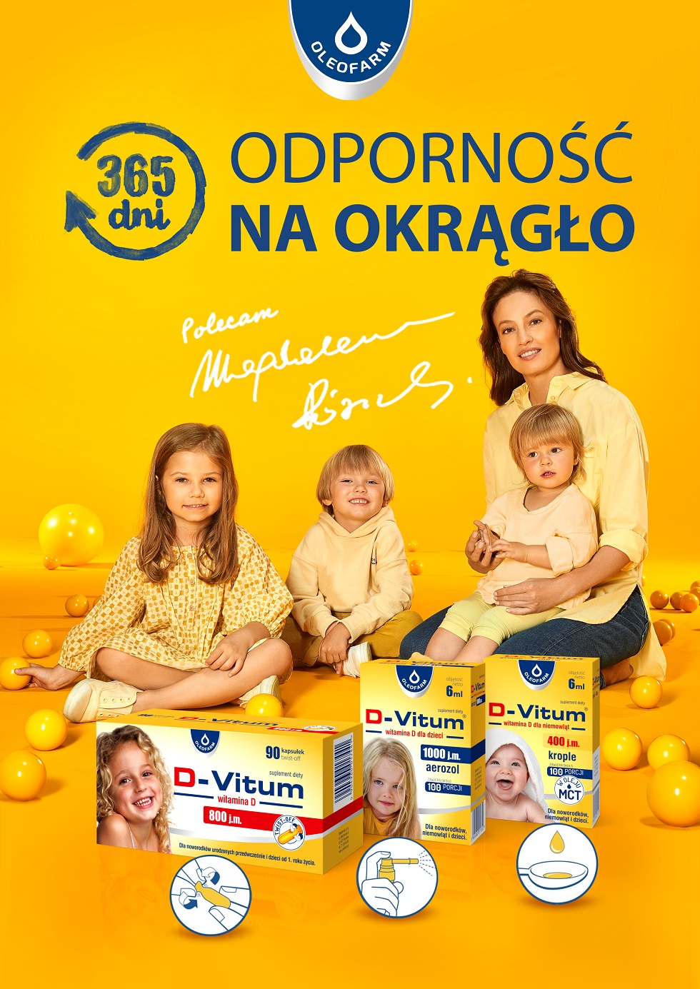 Spoty dla D-Vitum Forte i D-Vitum dla dzieci bazują na wspólnej platformie komunikacyjnej „Na okrągło”. Podkreślają wagę suplementacji i podkręcania odporności przez okrągły rok. Spot D-Vitum Forte podkreśla dodatkowo unikatową formułę suplementu – witaminę D zawieszoną w oleju lnianym, a wersja dla dzieci komunikuje różnorodność dawek i form podania. Trzecia reklama zrealizowana dla marki D-Vitum Forte K2 opiera się na teatralnej fabule i podkreśla wielką rolę suplementu w utrzymywaniu odporności oraz dbaniu o zdrowie kości.