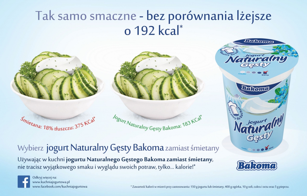 W ramach promocji jogurtu naturalnego, marka Bakoma prowadzi działania komunikacyjne w telewizji, prasie oraz w Internecie (w towarzystwie programów w usłudze VoD). Skierowane są one do kobiet lubiących gotować oraz zwracających uwagę na prozdrowotne aspekty dań. Spot oraz advertoriale w prasie kobiecej i poradnikowej podkreślają konsystencję oraz uniwersalność jogurtu naturalnego gęstego Bakoma. Produkt z powodzeniem zastępuje śmietanę i przydaje się zarówno podczas przygotowywania deserów, jak i potraw wytrawnych.
