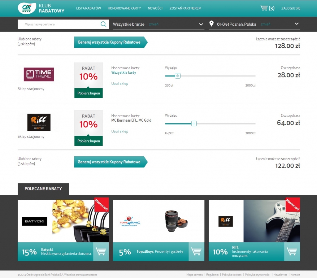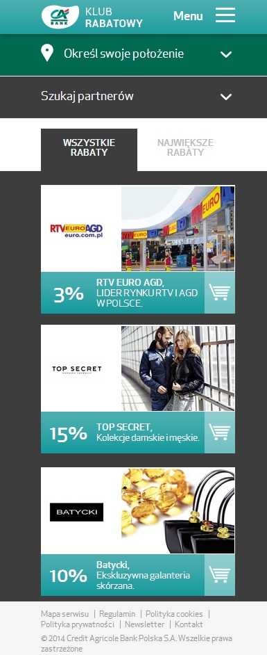 Jeśli klient banku szuka konkretnego partnera, to korzystając z wyszukiwarki znajdującej się na stronie Klubu Rabatowego, odnajdzie go bez trudu, a nawigator wskaże mu najkrótszą drogę do sklepu. Najbardziej interesujące oferty, posiadacz karty płatniczej Credit Agricole – analogicznie jak w sklepie internetowym – może dodawać do „koszyka rabatów” i wygenerować w postaci kuponów zniżkowych.