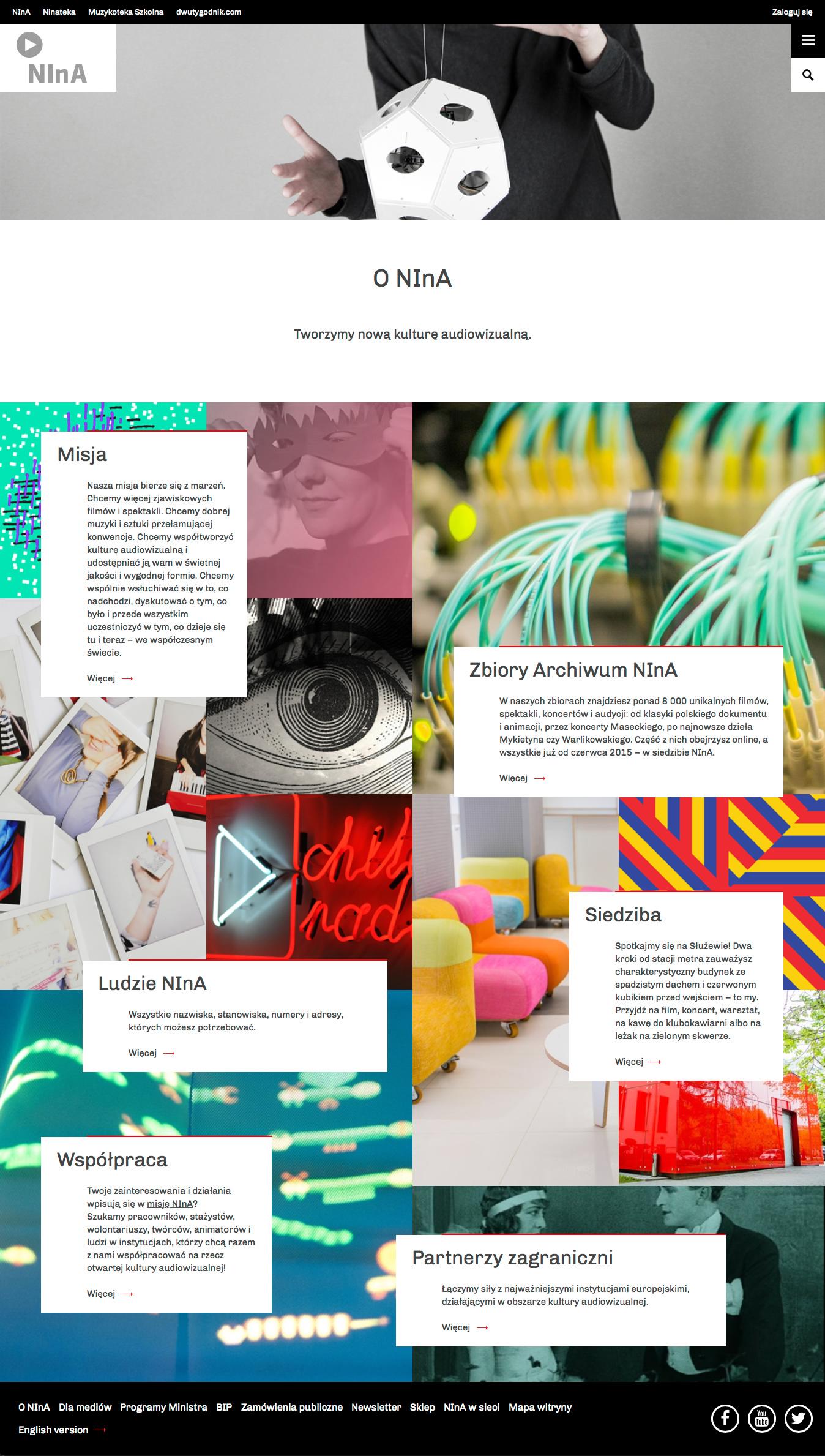 Nowa strona Narodowego Instytutu Audiowizualnego to nie tylko odświeżony i nowoczesny graficznie wygląd. Portal zyskał przede wszystkim na funkcjonalności i interaktywności. Architektura informacji została zaprojektowana w taki sposób, aby użytkownicy mogli prosto i intuicyjnie korzystać z ponad 5000 materiałów ze zbiorów NInA dostępnych online. Do materiałów oferowanych przez NInA należą zarówno archiwalne, jak i współczesne, programy radiowe i telewizyjne, dokumenty, filmy, sztuki teatralne i koncerty.
