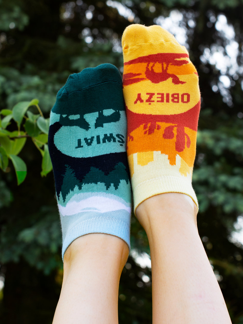 W kolekcji nie zabrakło również skarpetek – najbardziej przykuwają wzrok zielone JARZYNY / JEŻYNY bazujące na wyrafinowanej zabawie polszczyzną. Znajdziemy w niej również asymetryczne skarpetki WAKACJE w akacje, które łączą w jedno dwa słowa kojarzące się z błogostanem i beztroską. W ofercie pojawiły się również skarpety stopki w trzech oryginalnych wzorach: ŻE TĘ, WELTSCHMERZ i OBIEŻYŚWIAT.
