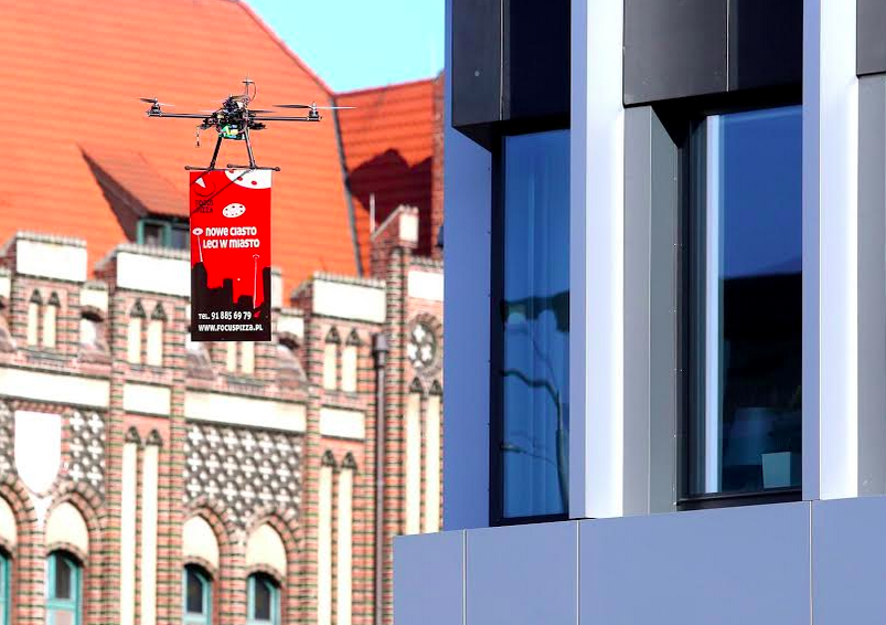 „Nowe ciasto leci w miasto” to hasło reklamowe przyświecające kampanii promocyjnej nowego konceptu gastronomicznego Focus Pizza, oferującego pizzę w dostawie w centrum Gdańska oraz Szczecina. Promocja oferty odbyła się za pomocą latającego drona, który poruszał się wokół budynków biurowych położonych przy Bramie Portowej w Szczecinie. Unosił on specjalny plakat reklamowy promujący nowego dostawcę – widoczny zarówno dla osób pracujących w biurowcach, jak i okolicznych przechodniów. Wydarzenie było wspierane akcją rozdawania ulotek, zawierających szczegółowe menu oraz dane kontaktowe do pizzerii. Docelowo sieć Focus Pizza chciałaby dostarczać swoje produkty za pomocą specjalnie przystosowanej floty dronów.