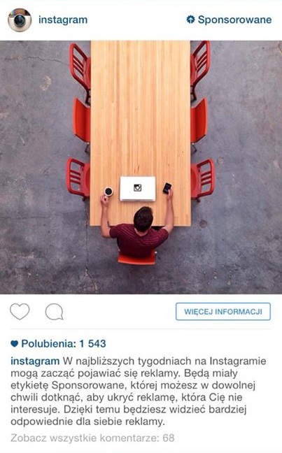 Kilka dni temu na Instagramie pojawiła się informacja na temat wprowadzenia reklam. Wyświetlane będą one w formie zdjęcia z etykietą „Sponsorowane” jedynie użytkownikom aplikacji mobilnej.