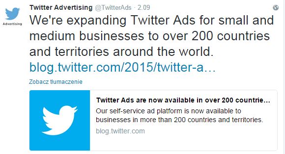 Platforma reklamowa na Twitterze dostępna jest dla ponad 200 krajów, a reklamy mogą być publikowane w 15 językach. Do tej pory możliwe to było jedynie dla 33 krajów.