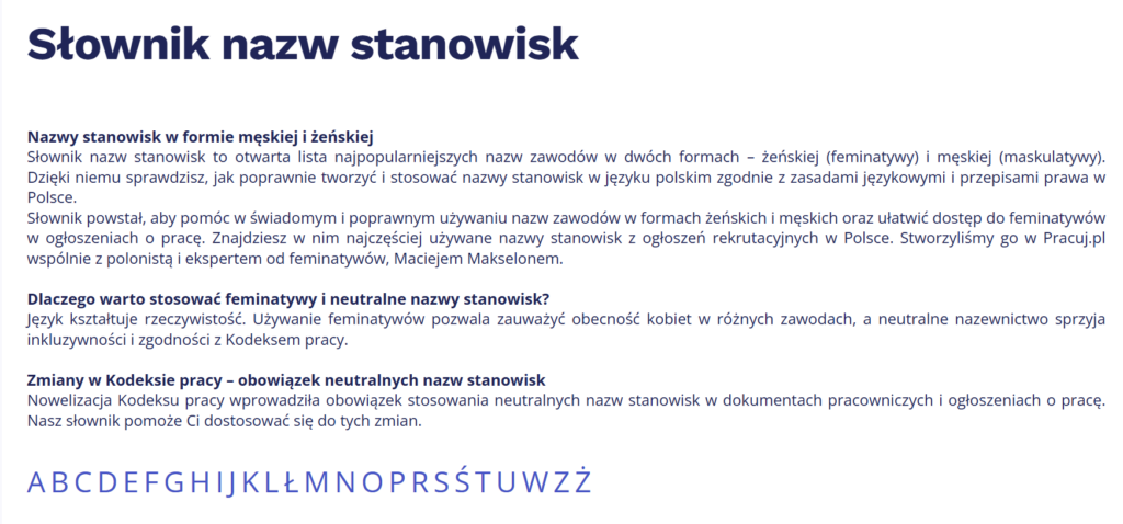 Co więcej, wyjątkowo pomocnym narzędziem w nadchodzącym okresie może się okazać słownik nazw stanowisk od Pracuj.pl. Opracowanie firmowego katalogu neutralnych nazw ułatwia spójną komunikację we wszystkich kanałach – ogłoszeniach, opisach stanowisk i dokumentach HR.